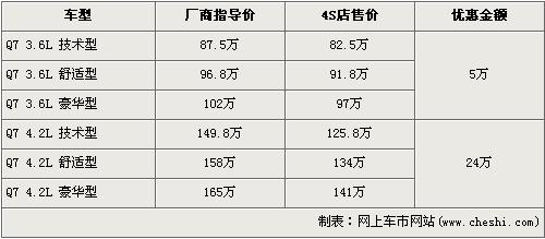 据经销商销售人员介绍,奥迪Q7分为3.6L和4.2L两种排量共7款车型,目前全系最高优惠为25万元现金。3.6L车型优惠5万元,优惠后售价分别为:技术型82.5万元,舒适型91.8万元,豪华型97万。排量更大的4.2L车型优惠更是达到了24万元,优惠后售价分别为技术型125.8万元,舒适型134万元,豪华型141万元。