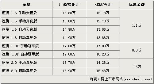 据北京一汽大众经销店销售人员介绍,在上海车展上亮相的速腾1.4TSI最早预计将在6月上市销售,预售价格可能不会低于16万元,此车的上市将会取代目前在售的速腾2.0升自动挡车型。近期购买速腾在售车型的消费者都可以得到不同程度的优惠,速腾1.6L车型优惠1.1万元,1.8T冠军版车型优惠8000元,2.0L车型优惠金额达到了全新最高的1.5万元,但是2.0L车型目前店内无现车,预购买者需交订金1000元,约等一周后可提车。