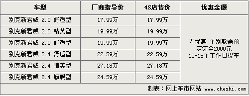 据4S店销售人员介绍,目前新君威全系还没有优惠出现,各经销商处有一部分现车已经到店。而热销的红色款车型仍然是订单制销售。目前可选的现车颜色有金色、灰色等款。消费者如果订车的话,需要交2000元订金,在10-15个工作日内便可以交车。