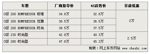 据4S店销售人员介绍:目前奔驰C优惠幅度较大,全系购车送全险,同时C200K优惠达2万元,C230、C280优惠更是达到2.5万元。不过目前现车较少,有些车型需要预订,预定周期为1个月左右。C200K优雅型与C230时尚型现车较少,C230时尚型甚至将要停产,由于这两款车价格与其它3款车型价格相近,并配置有些令人不满,所以将要停止生产。