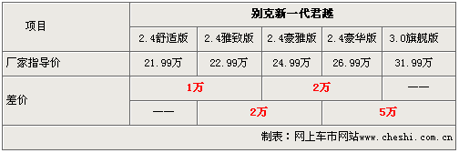新君越2.4排量共有四款车型,由于外观、内饰和舒适豪华配置的差异,两款入门级车型的差价为1万元,而其它三款车型之间的差价均为2万元。而新君越2.4豪华版和3.0旗舰版除配置差异外,动力性能也存在一定的差距,所以差价高达5万元。