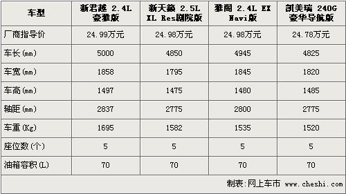 提到中级车市场,人们便会很快的想到新雅阁、新凯美瑞和新天籁这三款日系车型,它们在中级车市场里算是鼎鼎有名的“三位”了。随着今年7月8日别克继新君威后的又一力作新一代君越的正式上市,中级车市场迎来了又一款“重量级”车型。新君越的上市更加巩固了别克在中级车市场的位置,并且给同级别的中级车带来了更强的竞争力。既然有新车型加入了队列,那么同级车之间价格和配置的“竞争战”是必不可少的。下面我们就为您挑选了新君越2.4L豪雅型、新天籁2.5L XL RES剧院版、雅阁2.4L EX导航版和凯美瑞240G 豪华导航版四款价格相近的中级车作为比较,看看这四款热门车里,哪款车型更适合将要购入中级车的您。