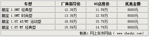 酷宝系列车型,不仅外形时尚,动力也相当充沛,不仅可与进口跑车如莲花竞速相媲美,也带动了自主跑车市场的竞争。近期网上车市网站了解到,随着市场竞争的加剧,现在各家4S店均可给出全系8000元的现金优惠,令此车型再次引起关注。具体详情如下: