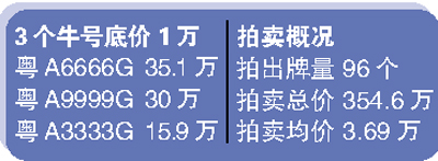 这次竞拍会上最受瞩目的无疑是粤A3333G、粤A6666G、粤A9999G三个底价1万的四连号。最后,550号竞拍者以35.1万高价竞拍粤A6666G成功,成为本场“标王”。而上期标王粤A6666G仅拍出16万元。(记者谭德波)