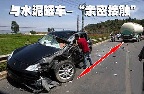09年5月10日14时左右在高海公路金宝山滇池附近的公路辅路上,发生了这样一起令人后怕的恐怖车祸。一台崭新的(准确的说,是还没有上牌的)保时捷卡宴,与一台拉着水泥运输大罐车“迎面相撞。