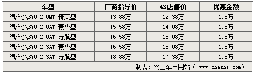 北京个各展厅内09款奔腾B70现车充足,店内现车近段时间优惠幅度较大,全系车型均可以给出1.5万元的优惠,相比前一段时间的1.1万元优惠幅度有所提升。现阶段销售较快的型号主要是2.0L的导航版车型,以及2.3L高配的两款车型。