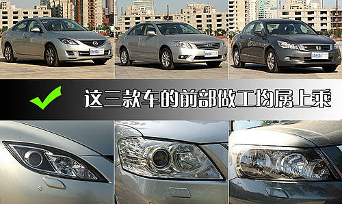 睿翼、凯美瑞和雅阁的外观设计各有千秋,但从整体上来看,这三款车的制造工艺水平延续了上一代车型贯有的细致入微,车身喷漆与各模具制造质量在同级别车型中均属上乘。大灯部分与保险杠、发动机盖、水箱框架等周围的接缝非常匀称。