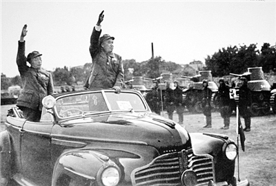 新中国成立后的13次国庆阅兵,毛泽东等党和国家领导人在天安门城楼上检阅人民解放军陆海空三军部队。解放军总司令朱德、国防部长彭德怀和林彪先后担任阅兵总司令,乘车检阅了受阅部队。因为建国初期,我国不能生产汽车,朱德、彭德怀先后乘坐美式轿车、苏联轿车检阅受阅部队。