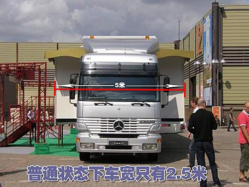 奔驰卡车上的这套豪华总统套房将成为世界上最大的单层房车,其面积达到90平米。这一卡车的车身长度达到18米,宽为9米,而其左右两侧的车身经过加宽令总的宽度达到5米。