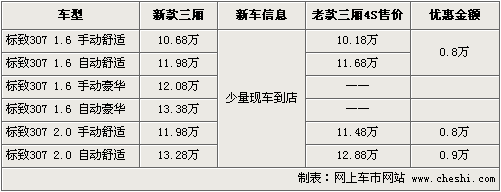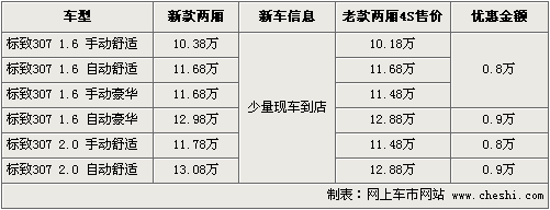 据东风标致北京地区4S店销售人员介绍,目前还有少量老款307车型在售,优惠幅度较大,手动档车型还赠送加油卡,现在购买比较划算。新款307车型少量现车已到店,但车型及颜色还不齐全,预订要交定金3千元,提车等1个月,而且暂无任何优惠。如想购买新款车型的朋友不妨等一阵时间,新款307大批量现车会陆续到店。