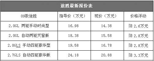 09款途胜上市后销量一直都不错,8月份售出了4331辆,在国内SUV销量榜中排在第五位,比同价位竞争对手狮跑和逍客高出不少。昨日,我们从北京地区的一家北京现代汽车综合经销商处了解到,近期09款途胜的价格已经趋于稳定,最高可优惠3.3万元。以下是09款途胜最新报价表: