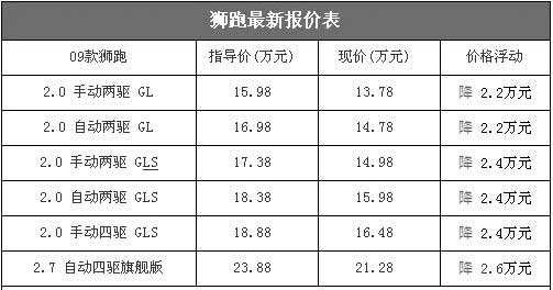 09款狮跑上市后,价格迅速下降,因此月销量能够稳定在4000辆左右。我们昨日从北京地区一家东风悦达起亚狮跑经销商处了解到,近期狮跑部分车型的优惠再次增加2000元,最高降幅已经增至2.4万元,性价比再次提升。目前狮跑最低配车型2.0手动两驱舒适版的售价为13.78万元,和历史最低价持平,和竞争对手途胜售价非常接近。以下是09款狮跑最新详细报价表: