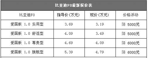 新奥拓16日上市之后热销,部分地区甚至出现了加价售车的情况,作为新奥拓最有直接的竞争对手,比亚迪F0近期的价格有没有变化呢?昨日,我们从北京地区的部分综合经销商处了解到,近期比亚迪F0最高可优惠6000元,其最低配车型爱国版1.0手动实用型的售价已经降至3.19万元,比QQ3 1.1L排量还要便宜,是国内1.0L以上排量中最便宜的新车,性价比出众。以下是比亚迪F0最新报价表: