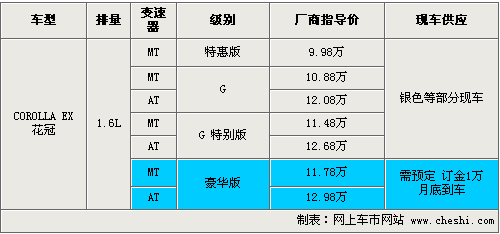 花冠EX系列两款豪华版车型在增加了天窗的基础上,还配置了真皮座椅、前阅读灯等实用配置。价格放买你相比较G特别版涨了3000元。新增加的4款车型均为1.6小排量车型,消费者在购车同时可以享受购置税优惠活动,目前尚没有现车到店,消费者购车的话需要交订金1万元,预计月底可以到车。