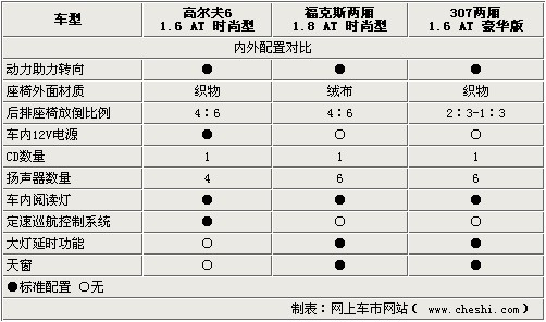 由于三车属于各系列中“低配”车型,所以我们看到的配置表稍显寒酸。三车采用织物座椅,虽然不显豪华,但实用性却比真皮面料更实用。我们仔细观察,高尔夫6配置不算丰富,但在实用性配置上却值得一提,车内12V电源、定速巡航装置、后排座椅可按4:6比例折叠。而福克斯和307在一些细节方面做得更好,6扬声器音响系统、大灯延时功能及天窗应有尽有,这也更符合国人购车习惯。