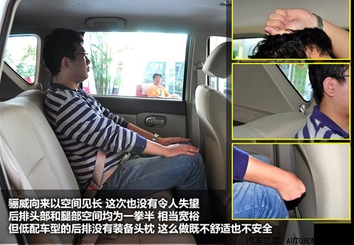 和其它小型车相比,骊威多少显得有些另类。达到紧凑级别的2600mm轴距使它成为了这个级别的轴距王,内部空间无疑是骊威最大的优势所在,但造就这样空间表现的外形设计却不是每个人都能接受的。此外我们发现骊威最低配全能型的后排座椅没有装备头枕,这对舒适性和安全性都有较大影响,因此并不建议购买最低配车型。
