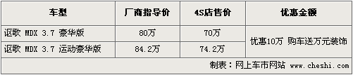 据讴歌北京地区4S店销售人员介绍,MDX车型优惠10万元,优惠后最低售价70万。现在购车赠送万元装饰,包括轮毂、轮胎升级及加装后排影音系统等配置。另据介绍,目前销售的讴歌MDX增加的实用性的配件包括前下护板和后下护板,能避免恶劣路况对底盘带来的损伤。店内现车非常充足,颜色也比较全,欲购买者挑选的空间非常大。如消费者有意购买,到店详谈会有更优惠的价格。北京地区各4S店由于订单不同,各店销售的现车颜色有所不同。