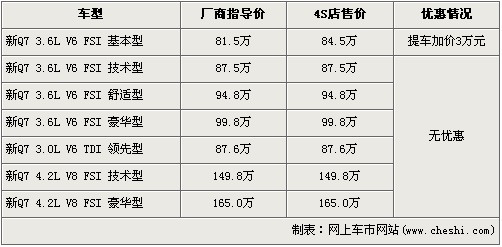 据北京奥迪4S店销售人员介绍,目前店内的奥迪新Q7现车只有售价为81.5万元的3.6L基本型有现车,并且消费者提现车需加价3万元,加价后的售价涨为84.5万元。销售人员还介绍,其他车型需交10万元订金预订,最快年底可交车。