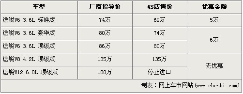 据经销商销售人员介绍,途锐的旗舰车型W12缸的6.0L顶配型已经停止进口。而3.6L的最低配3.6L标准型有5万元的优惠,优惠后售价从74万元下跌到了69万元,跌破70万元。并且3.6L豪华版和顶级版两款车型有6万元的优惠。销售人员还介绍,目前途锐4.2L无现车,欲购买者需交订金5万元,下个月可提车。