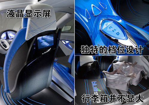 内饰方面大量采用了蓝色光,车内档位部分采用了类似盾形的设计,风格大胆,超乎人的想象。在驾驶座后排还安装有液晶显示屏幕,同时时尚的行李箱也透出新颖的概念设计。