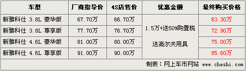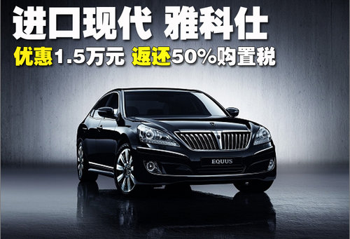 据进口现代4S店销售人员介绍,目前新雅科仕车型优惠1.5万元,并返还50%购置税。返还的购置税分别从2.9万-3.9万不等,其中4.6L尊享版购置税最高返还近4万元,最终购买价格约85.6万元。新雅科仕最低实际购买价格63.3万元。另据介绍,现购买新雅科仕还赠送高尔夫用具。如消费者有意购买,到店详谈会有更优惠的价格。北京地区各4S店由于订单不同,各店销售的现车颜色有所不同。