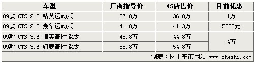 据4S店销售人员介绍:目前在售的凯迪拉克09款CTS共有2.8L和3.6L两个排量车型。这4款车型中,3.6升车型优惠幅度较大,2款车可优惠4万元;而2.8升车型优惠较少,豪华运动版仅优惠5000元。目前3.6升车型为数不多,喜欢的朋友请尽快与店内联系。颜色方面,2.8升精英运动版车型有白色、银色、金色,2.8升豪华运动版有红色车型,3.6升车型有红色、灰色车型。另外,年底或明年初将上市新款凯迪拉克CTS,并配备3.0升直喷发动机,对此车感兴趣的朋友请随时关注。