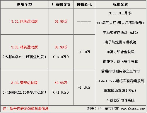 新推出的3款搭载3.0L SIDI引擎的车型,摒弃了上2.8L引擎,虽然排量仅增加了0.2L,但最大功率、峰值扭矩数值却增加了很多。相比老款2.8L发动机,这款3.0L智能直喷发动机最大功率增加了48千瓦,峰值扭矩也增大了58牛米,相信没有人会轻视这款引擎的实力。除此之外要说明的是,3.0L精英运动版与3.0L豪华运动版分别代替了09款同款车型,标配了18英寸铝合金轮毂,但价格均提高了1.18万元,其它配置没有任何变化。2010款3.0L车型的上市,09款2.8L车型完成了自身“生命周期”,2.8L所有车型将停产。