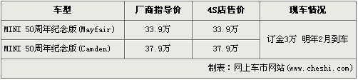 MINI在诞辰50周年之际将推出两款纪版车型,分别为MINI 50 Mayfair和MINI 50 Camden车型。在本届广州车展上,MINI首次携带此两款纪念版车型在大众面前亮相。据了解,北京各家MINI经销店已经可以接受此辆款车的预订,具体价格详情请看下表: