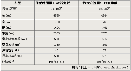 目前菲亚特引入国内销售的进口领雅搭载了1.4T涡轮增压发动机,级别与上海大众的速腾1.4T轿车相当,首先我们选择了价格上最为接近的两款车,通过车身尺寸、动力、配置和舒适性配置方面具体来对比一下它们之间的差异。