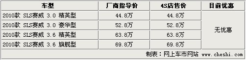 据4S店销售人员介绍:目前2010款赛威店内只有展车,并无现车销售。如需预定需交订金2万元,最快本月底可以购车,最晚1月底到车。虽然新款SLS赛威已经上市,但还存有09款车型,除了3.6升精英版无现车外,2.8升两款及3.6升豪华版仍有现车,2.8升精英型有灰色、黑色车款,其余两款全部为黑色。优惠价格方面,2.8升老款车型可优惠5万元,3.6升旗舰型可优惠8万元。
