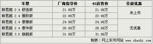 据通用别克4S店销售人员介绍:新君越北京地区在售车型仅为3款,分别为2.4升豪雅版、2.4升豪华版、3.0升旗舰版。在售车型部分车款有现车,预订需等2-4周时间,目前新君越2.4升豪雅版现车相对较多,颜色有灰色、黑色、银色,喜欢的朋友请及时与店内联系。据4S店称,新君越2.4升雅致版目前明年初投产,如果对此车款感兴趣的朋友许多等待一段时间。如预定3.0升车型需等3个月以上时间,预定时间较长。目前购车可送一些常用小物件,譬如水杯之类等,各家4S店赠送物品有所不同。