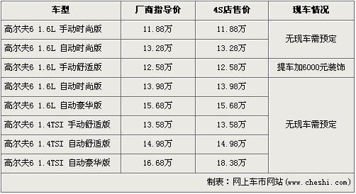 据北京一汽大众4S店销售人员介绍,目前高尔夫6全系只有1.6L手动舒适版有现车,欲提这款车型的消费者需在购车时加装店内价值6000元的装饰后方可提车。店内其他车型均无现车,欲购买者需交订金2000元,约等3个月后才可提车。