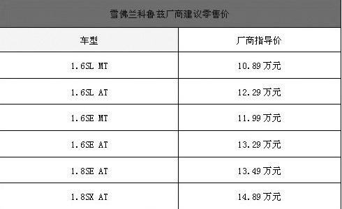 2009年4月9日,上海通用汽车公布了倍受关注的新生代性能中级车雪佛兰科鲁兹的售价。雪佛兰科鲁兹此次共有1.6L和1.8L两款排量六种不同配置的车型,配备五速手动和S6六速手自一体变速箱,并有六种车身颜色可供选择,最终价格区间定为10.89-14.89万元。即日起全国各地的雪佛兰经销商店开始接受预订。