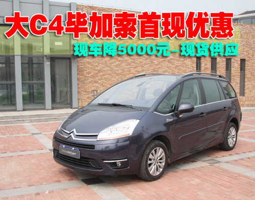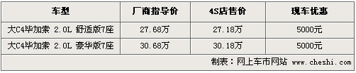 据4S店销售人员介绍,目前C4大毕加索现车可优惠现金5000元, 全系车型有舒适版和豪华版两款车型,售价分别为27.68万和30.68万。目前现车供货比较充足,现车颜色也比较齐全。