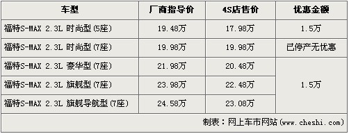 据北京福特4S店销售人员介绍,店内在售的福特S-MAX有1.5万元的现金优惠,并且7座的时尚版车型已经停产。经1.5万元优惠后,2.3L豪华版、旗舰版、旗舰导航版的售价分别降为了20.48万元、22.48万元和23.08万元,入门级的5座时尚型售价降到了17.98万元。