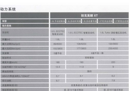 1.6T引擎在英朗上面的应用可以说是最具吸引力的亮点,在接近1800到6000转的引擎转速区间内,都是1.6T引擎最大235NM扭矩的输出范围。这台发动机还运用了“Super boost超推进”功能,能使发动机在5秒钟内将最大扭矩飙升至266 Nm,从而使别克英朗0-100 km/h加速时间定格在9秒。另外两款引擎为自然进气引擎,更加突出性价比和油耗方面的经济性。