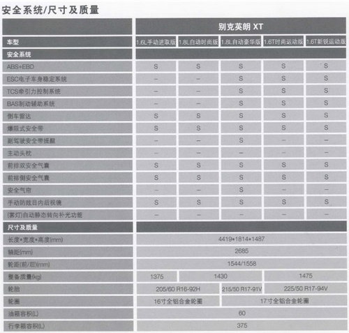 别克英朗提供了较多的车辆电子安全系统,包括:ABS、EBD、CBC、EDC,最新版本的ESC系统和大尺寸刹车碟。前排4只安全气囊在同级别车型的配备中算得上是中规中矩,没有侧面头部安全气帘也许是英朗整车上为数不多的因成为而妥协的安全配置。