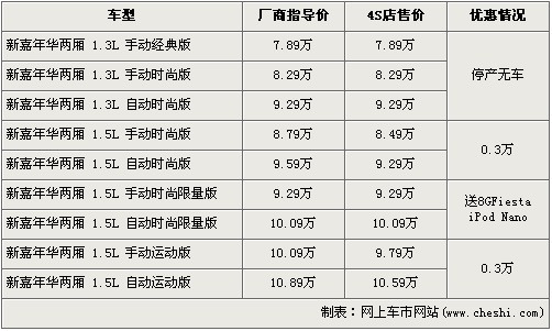 据北京福特经销商销售人员介绍,两厢嘉年华1.3L车型已经停产,各店已经没有现车。1.5L时尚版以及运动版车型目前有3000元的优惠,而刚上市的限量版车型虽然没有现金优惠,但是购买的消费者可以得到嘉年华定制的8G ipod Nano。