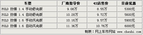 据4S店销售人员介绍:目前POLO劲情全系仅为4款车型。之前的1.4升手动挡两款车型合并为1.4手动舒尚版,1.4升自动挡两款车同样合为1.4自动舒尚版。其余1.6升两款车型不变。目前全系最高优惠6000元,其余三款车优惠幅度都有所不同。目前全系现车比较少,个别4S店有少量现车。如需预定1.4排量车型最短等7-10天,最长等1个半月;1.6升车型预订需等2个月左右。我们建议购买银色、蓝色、红色车款,这3种颜色车型预定时间短,且店内个别车型有此颜色现车。