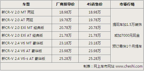 笔者从经销店了解,目前CR-V仍需要加价购车,提现车需要加7000元现金或者加装1.5万元的装饰,装饰项目包括了脚垫、尾翼、行李架、踏板等。消费者可根据需求选购,目前2.0和2.4自动档有黑色、银色现车供应,但颜色不齐全,订车的话订金为1-2万元,最快1个月可以提到车。