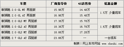 据东风悦达起亚4S店销售人员介绍,目前狮跑2.0车型高配车型优惠1.6万元,低配车型优惠1.5万元,其中2.0两驱最低售价14.28万元,目前自动档现车不太齐全,部分车型颜色还是需要预订,订金为2千元,最快半个月内可以提到车。另外如购买2.7车型到店详谈会有更高的优惠幅度。另据介绍,少量的现车中已加入导航、倒车影像系统等配置,价格方面也有所增加。如消费者有意购买,到店详谈会有更优惠的价格。北京地区各4S店由于订单不同,各店销售的现车颜色有所不同。