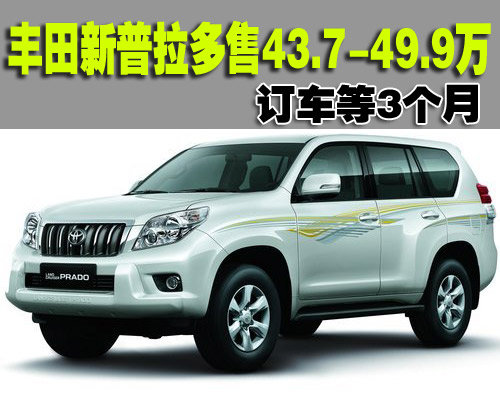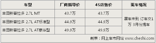 目前丰田正式宣布新款普拉多上市,笔者了解,北京地区经销商已经开始接受消费者的订单。新款2.7L共有三款车可供哦你选择,售价从43.7万-49.9万。目前展车和现车尚未到店,预订的话先交1万订金,3月份现车可到店,但具体交车日期4S店表示尚无法确定。