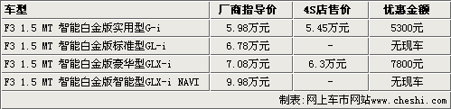 据比亚迪汽车4S店销售人员介绍,目前比亚迪F3智能白金版只有实用型和豪华型有现车销售,智能型和标准型都现车不足。现在购买比亚迪F3智能白金版可以有较大的优惠幅度,其中实用型可以优惠5300元;豪华型也可优惠7800元。该比亚迪4S店销售人员表示,如果到店详谈,还可以有更多的优惠幅度。