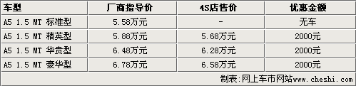 据奇瑞汽车4S店销售人员介绍,目前奇瑞A5标准型由于配置太低,4S店内无车销售,其他三款车型现车都比较齐全。现在A5的优惠幅度比元旦前要少,只能优惠2000元,而且不能赠送装饰。