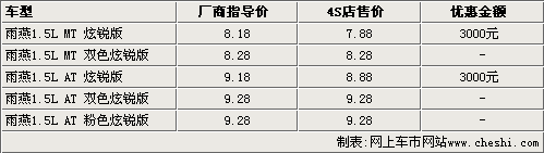 据长安铃木4S店销售人员介绍,雨燕目前现车并不多,炫锐版手动挡和自动挡两款车型目前只能优惠3000元。以外,还有手动双色炫锐版,目前只有极少现车,并且没有任何优惠。而自动双色炫锐版和粉色炫锐版目前都没有现车,预订需要等15天左右。