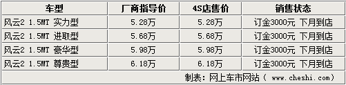 奇瑞经销商表示,现在店内的风云2新车不全,消费者购车需要缴纳3000元订金并等待半个月才可提车。由于是全新的车型,所以现阶段购车暂时没有任何形式上的优惠。