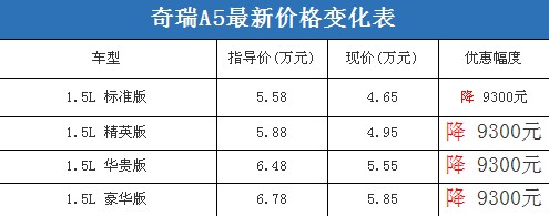 近日,编辑从北京地区综合经销商处了解到,奇瑞A5的现车充足,有黑色和灰色现车;目前购车的优惠幅度接近1万元,最低配的标准版奇瑞A5已经仅售4.65万元。据经销商透露,消费者要想以这个价格提车,需要在店内做一条龙,其中车辆四项基本保险可以打9折。以下是奇瑞A5最新价格变化表: