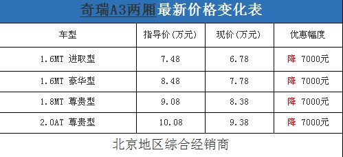 近日,编辑从北京地区综合经销商处了解到,奇瑞A3的现车充足,颜色也比较齐全,提供给消费者的选择空间较大;目前购买该车全系都可以优惠7000元现金,与之前的降价幅度相比有了小幅度的提升,性价比很不错。据经销商透露,消费者要想以这个价格购车,需要在店内做一条龙服务,其中车辆四项基本险最低可以打7折(约合2500-3000元左右)。以下是奇瑞A3最新价格变化表: