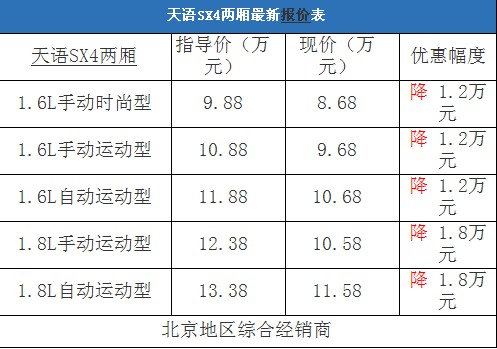 近日,编辑从北京地区长安铃木综合经销商处了解到,天语SX4两厢有黑色和红色现车,目前购车最高有1.8万元的现金优惠,并且赠送汽车装饰,性价比非常不错。据经销商透露,消费者想要以这个价格提车,需要在店内做一条龙服务,其中车辆四项基本保险可以打8.5折(约合3500-4100元左右)。以下是天语SX4最新价格变化表:
