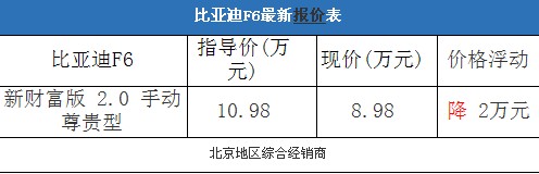 比亚迪F3是去年的销量冠军,和F3相比,比亚迪F6要低调很多,但是这并不意味着F6的性价比低。昨日,编辑从北京地区的几家比亚迪汽车综合经销商处了解到,近期比亚迪F6的优惠再次增加,销量最高的2.0手动尊贵版目前的降幅已经达到了2万元,购车后如果在店内做一条龙服务的话,还可以再优惠2000元,性价比非常不错。